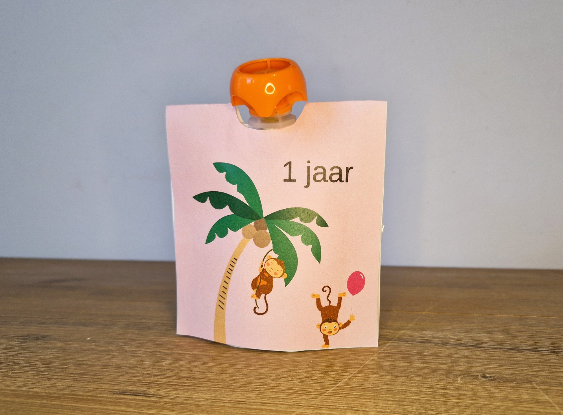 Vier een eerste verjaardag in stijl met deze feestelijke knijpfruitwikkel! Kies uit twee designs: vrolijke roze apen of stoere blauwe apen. Perfect voor traktaties die zowel jong als oud laten glimlachen.